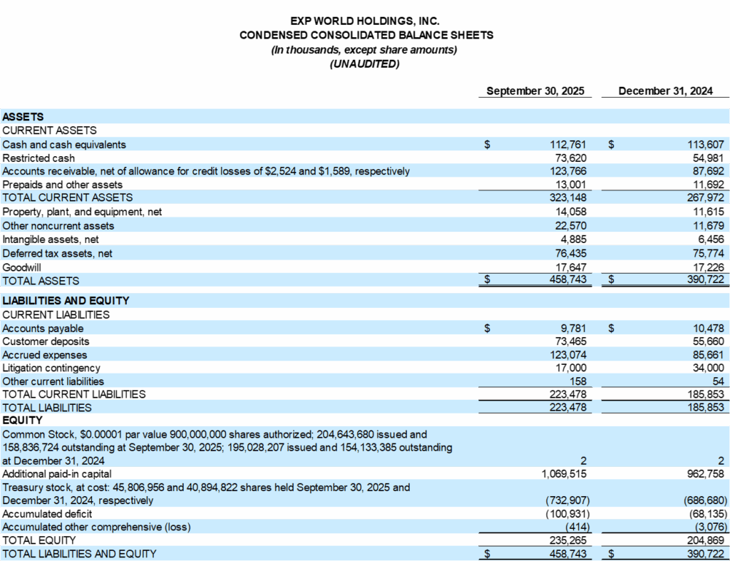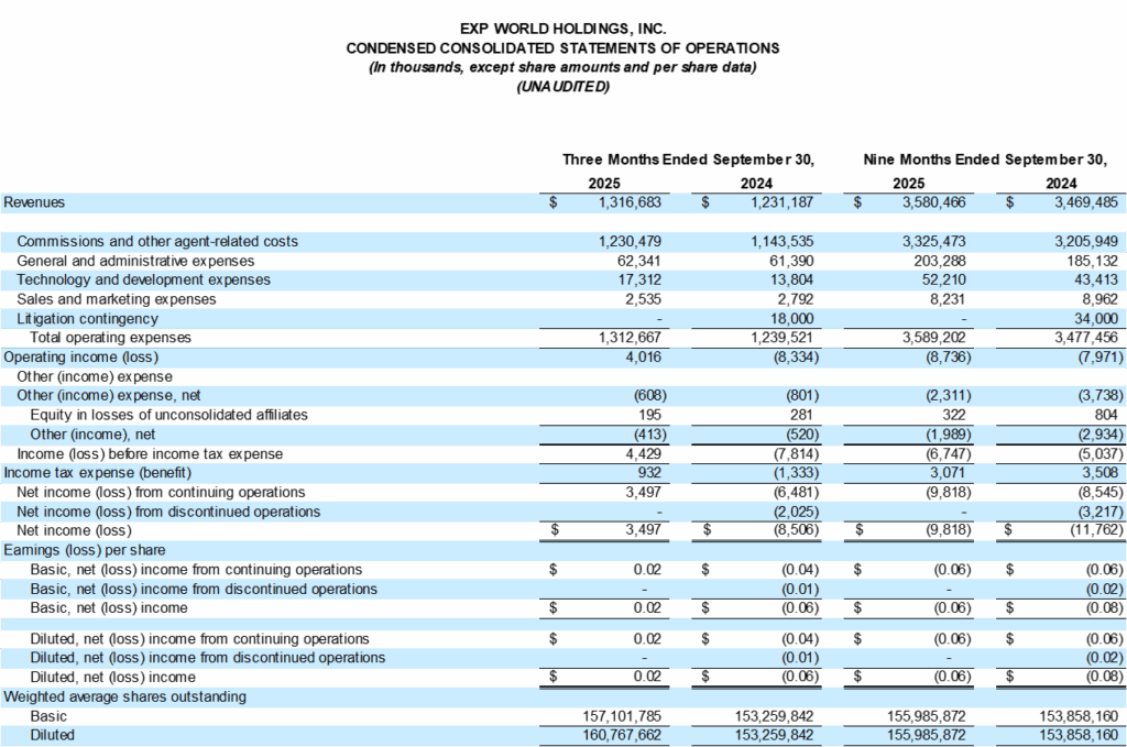 BELLINGHAM, Wash. — November 6, 2025 — eXp World Holdings, Inc. (Nasdaq: EXPI), or the “Company”, the holding company for eXp Realty®, FrameVR.io and SUCCESS® Enterprises, today announced financial results for the third quarter ended September 30, 2025.