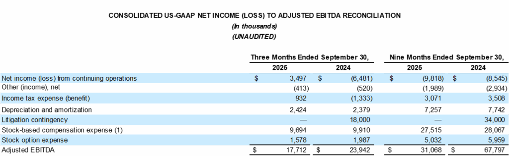- Adjusted EBITDA helps identify underlying trends in the business that could otherwise be masked by the effect of the expenses excluded in adjusted EBITDA. In particular, the Company believes the exclusion of stock-based compensation and stock option expenses provides a useful supplemental measure in evaluating the performance of operations and provides better transparency into results of operations. The Company defines adjusted EBITDA to mean net income (loss) from continuing operations, excluding other income (expense), income tax benefit (expense), depreciation, amortization, impairment charges, litigation contingency expenses, stock-based compensation expense, stock option expense and other items not core to the operating activities of the Company.