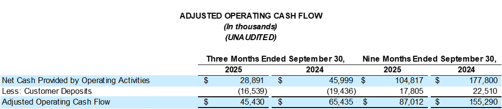 - Adjusted operating cash flow helps the reader understand the Company’s cash flow. The Company defines the adjusted operating cash flow to mean net cash provided by operating activities, excluding the change in customer deposits.