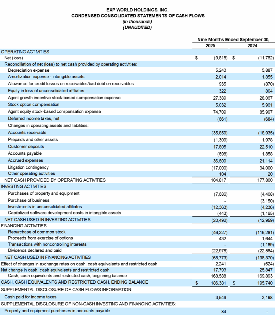 - eXp ended the third quarter of 2025 with a global agent Net Promoter Score (“aNPS”) of 75, down from 76 in the prior-year period. aNPS is a measure of agent satisfaction and an important key performance indicator given the Company’s intense focus on improving the agent experience.